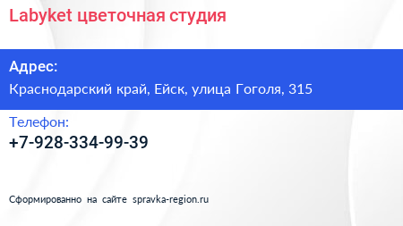 Labyket, цветочная студия по адресу Краснодарский край, Ейск, улица Гоголя, 315 в дальнейшем Организация, размещена в следующих категориях: