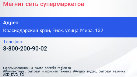 Магнит, сеть супермаркетов по адресу Краснодарский край, Ейск, улица Мира, 132 в дальнейшем Организация, размещена в следующих категориях: