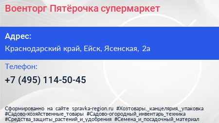 Военторг-Пятёрочка, супермаркет по адресу Краснодарский край, Ейск, Ясенская, 2а в дальнейшем Организация, размещена в следующих категориях: