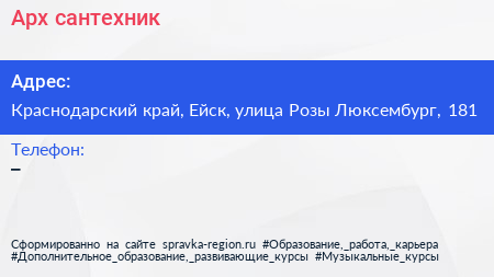 Арх-сантехник по адресу Краснодарский край, Ейск, улица Розы Люксембург, 181 в дальнейшем Организация, размещена в следующих категориях: