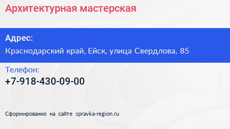 Архитектурная мастерская по адресу Краснодарский край, Ейск, улица Свердлова, 85 в дальнейшем Организация, размещена в следующих категориях:
