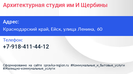 Архитектурная студия им. И. Щербины по адресу Краснодарский край, Ейск, улица Ленина, 60 в дальнейшем Организация, размещена в следующих категориях:
