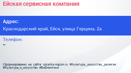 Ейская сервисная компания по адресу Краснодарский край, Ейск, улица Герцена, 2а в дальнейшем Организация, размещена в следующих категориях:
