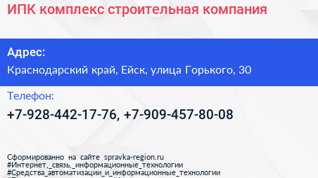 ИПК комплекс, строительная компания по адресу Краснодарский край, Ейск, улица Горького, 30 в дальнейшем Организация, размещена в следующих категориях: