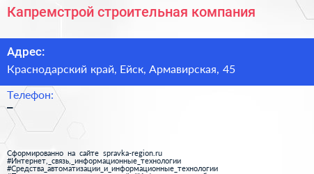 Капремстрой, строительная компания по адресу Краснодарский край, Ейск, Армавирская, 45 в дальнейшем Организация, размещена в следующих категориях: