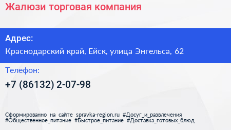 Жалюзи, торговая компания по адресу Краснодарский край, Ейск, улица Энгельса, 62 в дальнейшем Организация, размещена в следующих категориях: