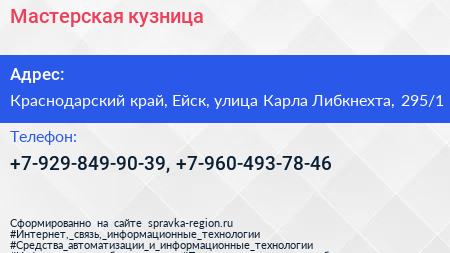 Мастерская кузница по адресу Краснодарский край, Ейск, улица Карла Либкнехта, 295/1 в дальнейшем Организация, размещена в следующих категориях: