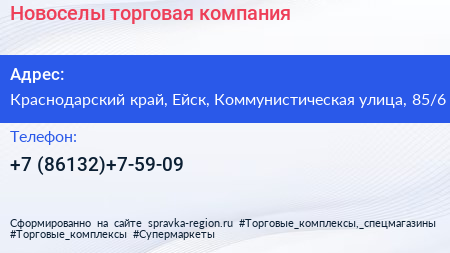Новоселы, торговая компания по адресу Краснодарский край, Ейск, Коммунистическая улица, 85/6 в дальнейшем Организация, размещена в следующих категориях: