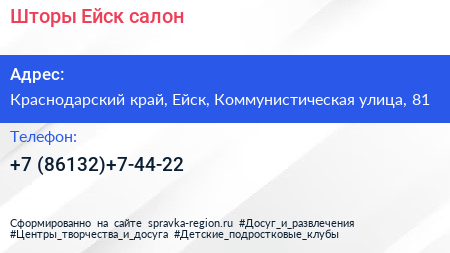 Шторы Ейск, салон по адресу Краснодарский край, Ейск, Коммунистическая улица, 81 в дальнейшем Организация, размещена в следующих категориях: