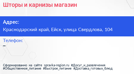 Шторы и карнизы, магазин по адресу Краснодарский край, Ейск, улица Свердлова, 104 в дальнейшем Организация, размещена в следующих категориях: