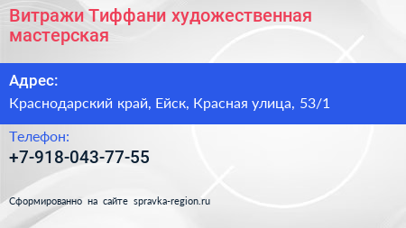 Витражи Тиффани, художественная мастерская по адресу Краснодарский край, Ейск, Красная улица, 53/1 в дальнейшем Организация, размещена в следующих категориях: