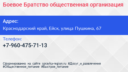 Боевое Братство, общественная организация по адресу Краснодарский край, Ейск, улица Пушкина, 67 в дальнейшем Организация, размещена в следующих категориях: