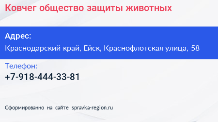 Ковчег, общество защиты животных по адресу Краснодарский край, Ейск, Краснофлотская улица, 58 в дальнейшем Организация, размещена в следующих категориях: