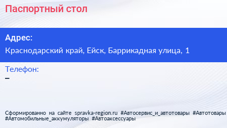 Паспортный стол по адресу Краснодарский край, Ейск, Баррикадная улица, 1 в дальнейшем Организация, размещена в следующих категориях: