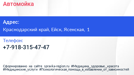 Автомойка по адресу Краснодарский край, Ейск, Ясенская, 1 в дальнейшем Организация, размещена в следующих категориях: