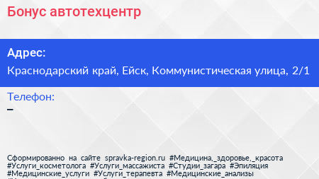 Бонус, автотехцентр по адресу Краснодарский край, Ейск, Коммунистическая улица, 2/1 в дальнейшем Организация, размещена в следующих категориях: