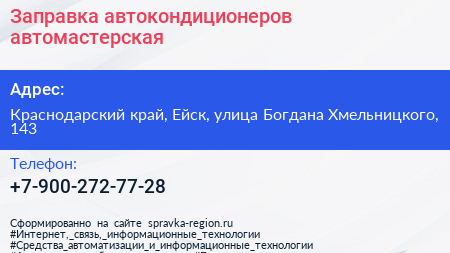 Заправка автокондиционеров, автомастерская по адресу Краснодарский край, Ейск, улица Богдана Хмельницкого, 143 в дальнейшем Организация, размещена в следующих категориях:
