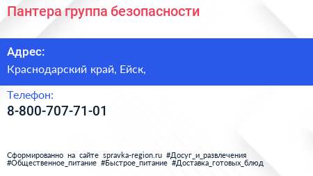 Пантера, группа безопасности по адресу Краснодарский край, Ейск, в дальнейшем Организация, размещена в следующих категориях: