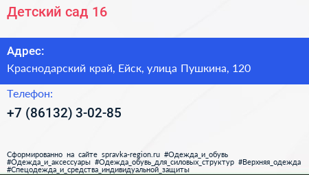 Детский сад №16 по адресу Краснодарский край, Ейск, улица Пушкина, 120 в дальнейшем Организация, размещена в следующих категориях: