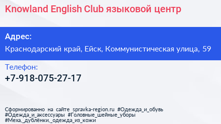 Knowland English Club, языковой центр по адресу Краснодарский край, Ейск, Коммунистическая улица, 59 в дальнейшем Организация, размещена в следующих категориях: