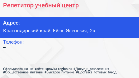 Репетитор, учебный центр по адресу Краснодарский край, Ейск, Ясенская, 2в в дальнейшем Организация, размещена в следующих категориях: