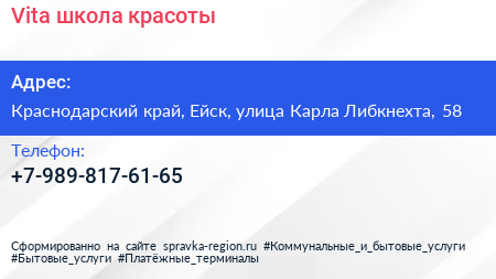 Vita, школа красоты по адресу Краснодарский край, Ейск, улица Карла Либкнехта, 58 в дальнейшем Организация, размещена в следующих категориях: