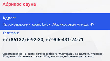 Абрикос, сауна по адресу Краснодарский край, Ейск, Абрикосовая улица, 49 в дальнейшем Организация, размещена в следующих категориях: