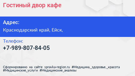 Гостиный двор, кафе по адресу Краснодарский край, Ейск, в дальнейшем Организация, размещена в следующих категориях: