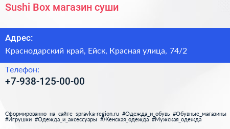 Sushi-Box, магазин суши по адресу Краснодарский край, Ейск, Красная улица, 74/2 в дальнейшем Организация, размещена в следующих категориях: