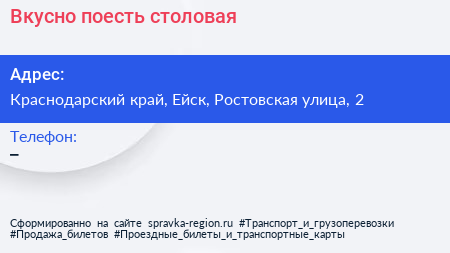Вкусно поесть, столовая по адресу Краснодарский край, Ейск, Ростовская улица, 2 в дальнейшем Организация, размещена в следующих категориях:
