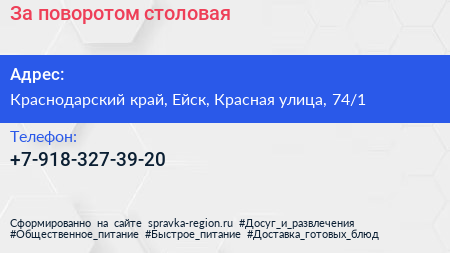 За поворотом, столовая по адресу Краснодарский край, Ейск, Красная улица, 74/1 в дальнейшем Организация, размещена в следующих категориях: