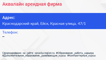 Аквалайн, арендная фирма по адресу Краснодарский край, Ейск, Красная улица, 47/1 в дальнейшем Организация, размещена в следующих категориях: