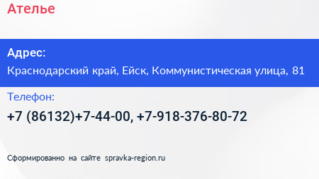 Ателье по адресу Краснодарский край, Ейск, Коммунистическая улица, 81 в дальнейшем Организация, размещена в следующих категориях: