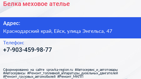 Белка, меховое ателье по адресу Краснодарский край, Ейск, улица Энгельса, 47 в дальнейшем Организация, размещена в следующих категориях: