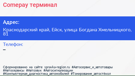 Comepay, терминал по адресу Краснодарский край, Ейск, улица Богдана Хмельницкого, 81 в дальнейшем Организация, размещена в следующих категориях: