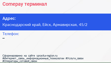 Comepay, терминал по адресу Краснодарский край, Ейск, Армавирская, 45/2 в дальнейшем Организация, размещена в следующих категориях: