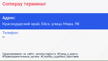 Comepay, терминал по адресу Краснодарский край, Ейск, улица Мира, 98 в дальнейшем Организация, размещена в следующих категориях: