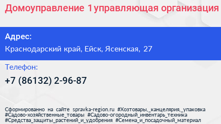 Домоуправление №1, управляющая организация по адресу Краснодарский край, Ейск, Ясенская, 27 в дальнейшем Организация, размещена в следующих категориях: