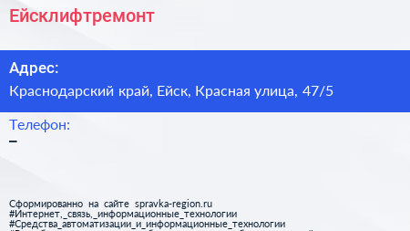 Ейсклифтремонт по адресу Краснодарский край, Ейск, Красная улица, 47/5 в дальнейшем Организация, размещена в следующих категориях: