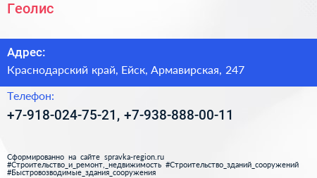 Геолис по адресу Краснодарский край, Ейск, Армавирская, 247 в дальнейшем Организация, размещена в следующих категориях: