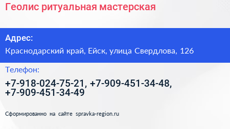 Геолис, ритуальная мастерская по адресу Краснодарский край, Ейск, улица Свердлова, 126 в дальнейшем Организация, размещена в следующих категориях: