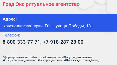 Град-Экс, ритуальное агентство по адресу Краснодарский край, Ейск, улица Победы, 131 в дальнейшем Организация, размещена в следующих категориях: