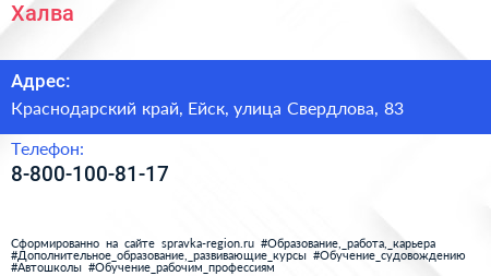 Халва по адресу Краснодарский край, Ейск, улица Свердлова, 83 в дальнейшем Организация, размещена в следующих категориях:
