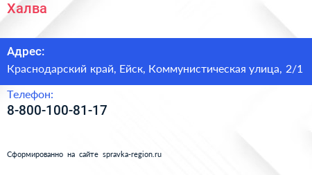 Халва по адресу Краснодарский край, Ейск, Коммунистическая улица, 2/1 в дальнейшем Организация, размещена в следующих категориях: