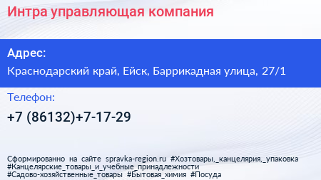 Интра, управляющая компания по адресу Краснодарский край, Ейск, Баррикадная улица, 27/1 в дальнейшем Организация, размещена в следующих категориях:
