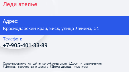 Леди, ателье по адресу Краснодарский край, Ейск, улица Ленина, 51 в дальнейшем Организация, размещена в следующих категориях: