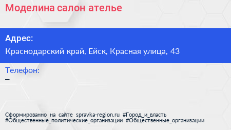 Моделина, салон-ателье по адресу Краснодарский край, Ейск, Красная улица, 43 в дальнейшем Организация, размещена в следующих категориях: