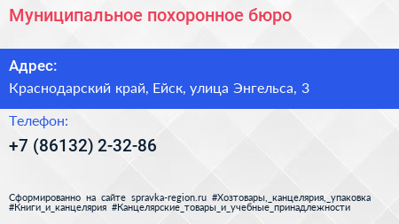 Муниципальное похоронное бюро по адресу Краснодарский край, Ейск, улица Энгельса, 3 в дальнейшем Организация, размещена в следующих категориях: