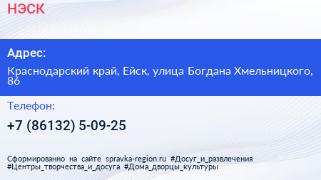 НЭСК по адресу Краснодарский край, Ейск, улица Богдана Хмельницкого, 86 в дальнейшем Организация, размещена в следующих категориях: