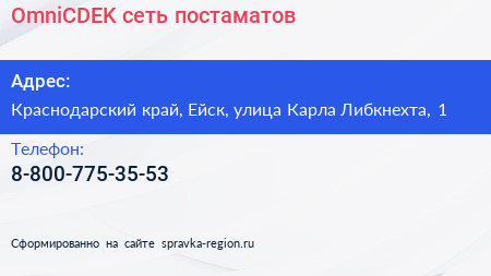 OmniCDEK, сеть постаматов по адресу Краснодарский край, Ейск, улица Карла Либкнехта, 1 в дальнейшем Организация, размещена в следующих категориях: